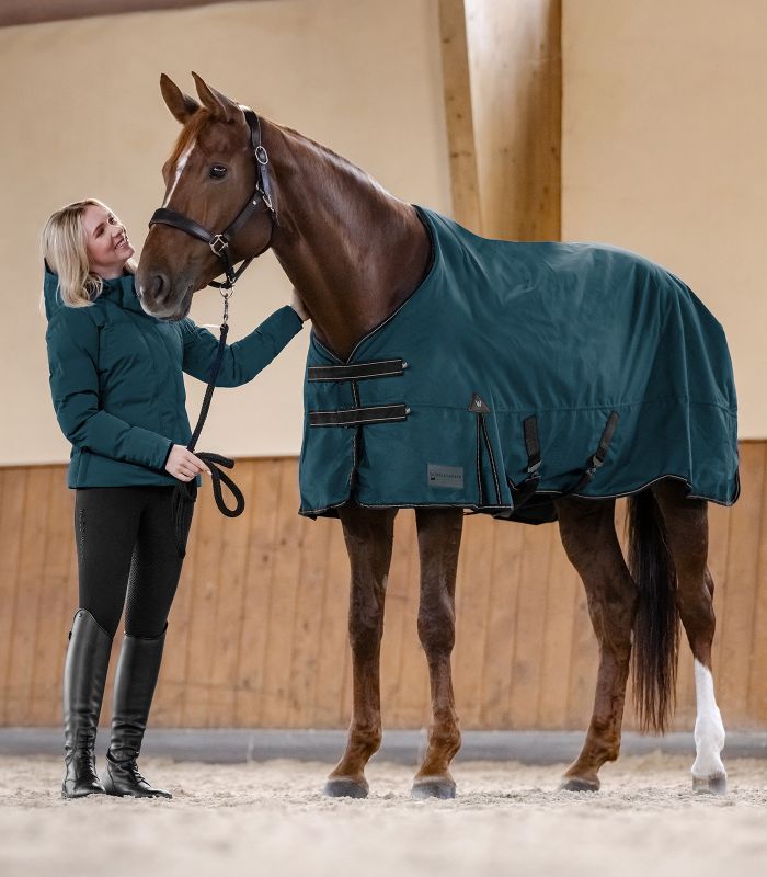 - 600 Denier Ripstop - Atmungsaktiv - Antibakterielles Innenfutter - Wasserdicht (Wassersäule 3000 mm) - Doppelter T-Frontverschluss mit schützender Klettabdeckung - Befestigungsschlaufen zur Anbringung eines Halsteils - Kompatibel mit dem Clip-In Deckensystem (Ösen und Ringe zur Befestigung einer Unterdecke) - Gehfalte für optimale Bewegungsfreiheit - Kreuzgurte - Schweiflatz mit reflektierendem Waldhausen Schriftzug - Waldhausen Design-Schnallen - Einfassband mit reflektierenenden Details für gute Sichtbarkeit - Mit praktischer Waldhausen Deckentasche - Mit Stay-Clean Inlay